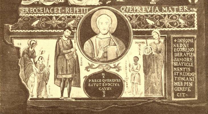 Lower down is a medallion of S. Clement, of the finest style of art. He is tonsured and has the nimbus. In his left hand he holds a closed book, and is blessing with his right. On a beautiful border, which is intersected by the medallion, are four doves turned towards the Saint. Beno, the donor of the picture, holds a candle on one side of the medallion; the Lady Mary is on the other side with her little boy Clement, both hold candles in their hands. Little Attilia, the sister of little Clement, has also her candle, and stands with her governess behind her father. Under the medallion-head of S. Clement is painted the very expressive and suggestive motto «me prece querentes estote nociva caventes» «seeking me in prayer beware of hurtful things ». At the extreme right is an inscription showing that this picture was a votive offering made by Beno to S. Clement, the patron of his boy: «In the name of the Lord, «I Beno De Rapiza, for the love of blessed Clement and the salvation of my soul, had it painted». (..) How can we account for the preservation of the pictures whose colours were so wonderfully bright when first cleared of the soil? By assuming that the church was only partially destroyed and immediately filled up after the devastation of 1084. Those who refer these paintings to the years intervening between 1085 and 1099, do so without a shade of probability. (..) We confess, however, that in the midst of this obscurity of data, and dearth of positive proof, we can find only two facts of which we are certain - 1st that the original basilica existed in 1058, as we learn from a monumental inscription lately found in the pavement of the narthex; 2nd that the modern church was built before 1299, because the tabernacle of the holy oils bears that date, and is an insertion later in style than the rest of the church. Mullooly
