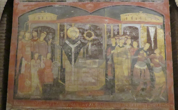 Lower church - nave: St. Clement celebrating mass with the inscription "Ego Beno De Rapiza cum Maria uxore mea pro amore Domini et beati Clementis P. G. R. F. C. » «I Beno De Rapiza with Mary my wife for the love of God and blessed Clement had it painted»