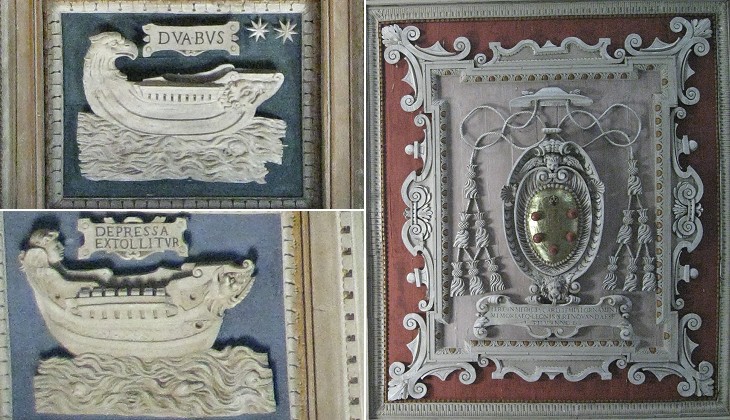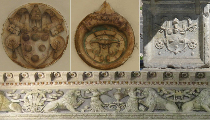Coats of arms and heraldic symbols of Pope Leo X: (above-left and centre) in the portico of the church; (above-right)