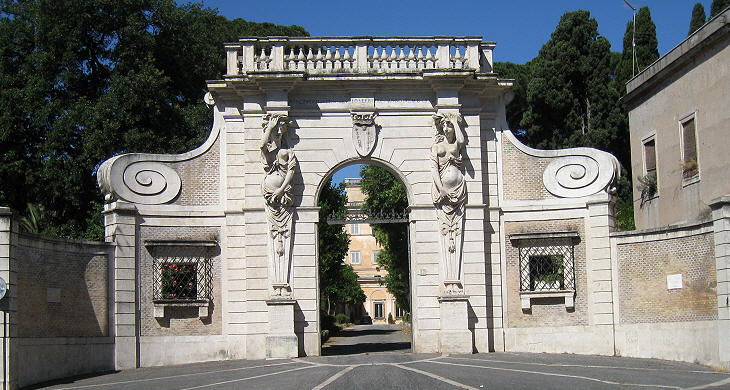 The current entrance to Villa Mattei is not that shown in the plate. It is the former main entrance to Villa Giustiniani and it was moved to this site in the 1920s when Villa Mattei was bought by the State and opened to the public. This entrance dates back to the early XVIIth century and it was designed by Carlo Lambardi. The Villa is also called Celimontana with reference to its location on the Caelian Hill (Mons Celius).