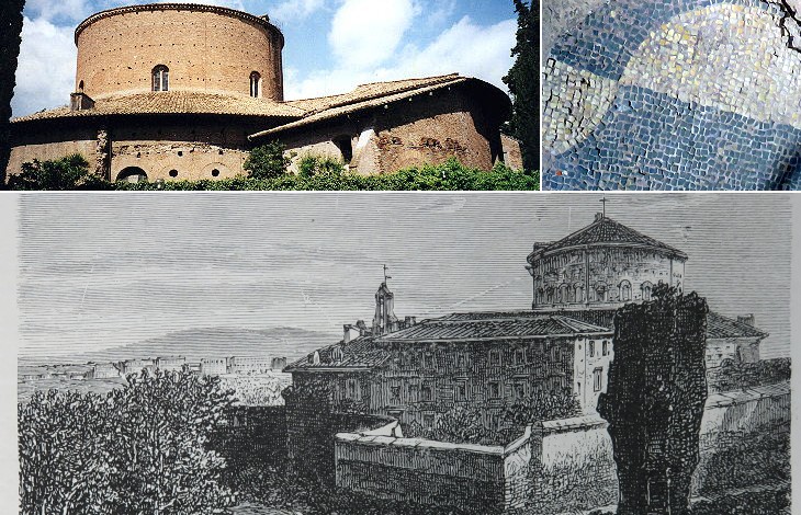 (above-left) The three round structures making up the church; (above-right) fragment of an ancient mosaic; (below) late XIXth century view from an illustrated book based on a photograph by Gustave Emile Chauffourier, a French photographer who began working in Rome in 1873