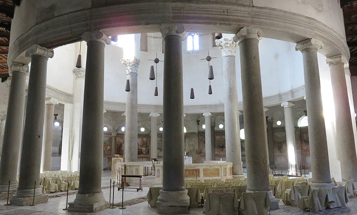 This large round church was founded by Pope Simplicius in ca 468 by making use of materials from previous buildings existing in the neighbourhood (most likely Macellum Magnum, a covered market built by Emperor Nero). Its shape was perhaps inspired by the round section of the Holy Sepulchre in Jerusalem. It had two circular rows of columns. The church was completed in the VIth century by Pope Felix IV. In the XIIth century Pope Innocent II strengthened the building by erecting two central very high columns to support the roof.