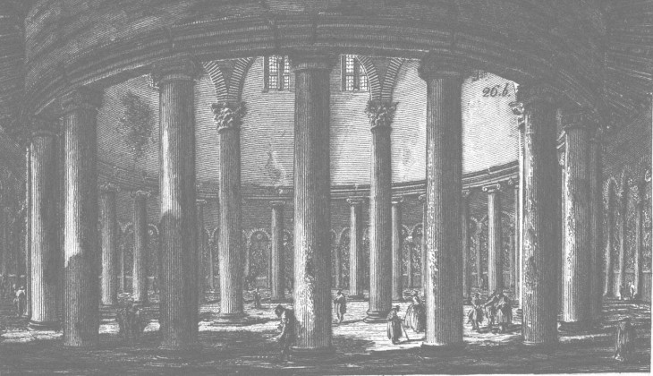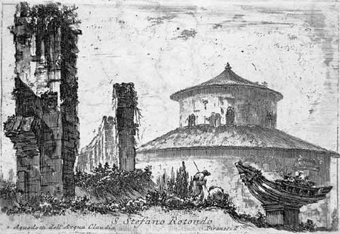 Because the church was thought to be a former monument of Ancient Rome, it attracted the interest of many Grand Tour travellers and Giovanni Battista Piranesi engraved two views of S. Stefano Rotondo which showed its exterior (it opens in another window) and its interior.