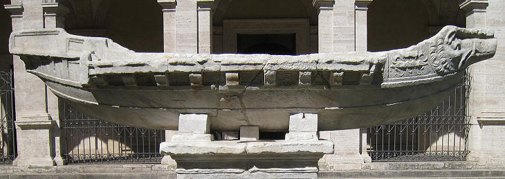 Navicella means little ship and the monument is a copy of a Roman sculpture which was found in the area. It was made in 1513 by order of Pope Leo X (a yoke, one of the heraldic symbols of the Pope can be seen on the bow). In 1931 its location and orientation were changed; it was perpendicular to the left side of the church and it became parallel to the central arch of the portico; in addition it was turned into a fountain. See a similar fountain at Giardino Colonna.