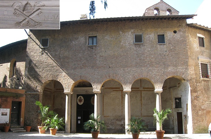 XVth century portico; (inset) coat of arms of Pope Nicholas V