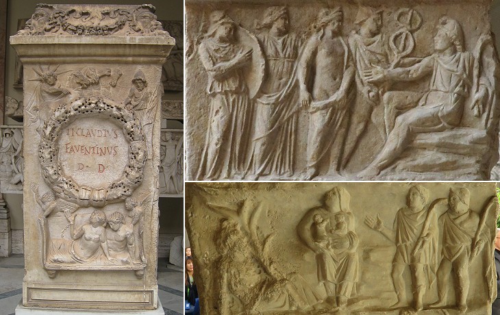 Musei Vaticani: (left) Ara Casali; (right) side reliefs depicting the Judgement of Paris (above) and Rea Silvia with Romulus and Remus (below)