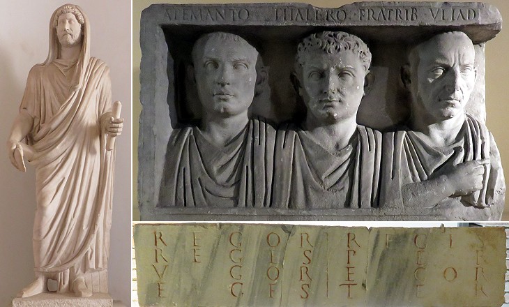century AD funerary relief depicting three brothers; it was found at the Casali farm near Porta S. Sebastiano;