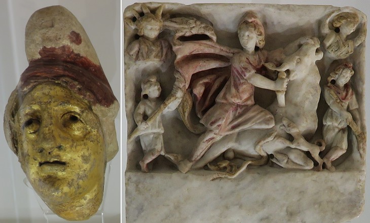 Museo Nazionale Romano: (left) a stucco gilded statue portraying the head of Mithra; (right) relief depicting the Killing of the Bull by Mithra (see a larger relief which was found in the same spot)