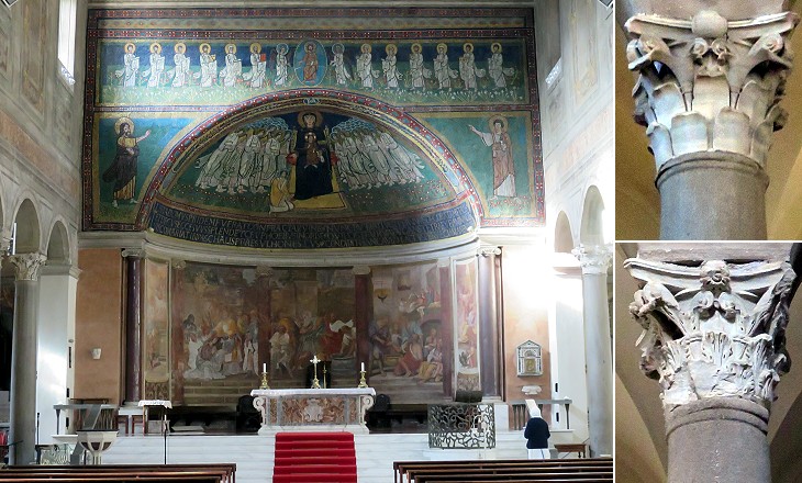 The interior retains its IXth century layout which was based on that of an ancient Roman basilica: a rectangular hall divided into three naves by rows of columns and with an apse at its end. The columns and the capitals were taken from ancient buildings. At the beginning of the XVIth century Andrea Sansovino repaired the church: the capitals with lotus leaves are perhaps a work by him, as they were very popular at the time (you may wish to see a similar ancient capital at Villa Adriana and a Renaissance one at S. Maria Porta Paradisi).