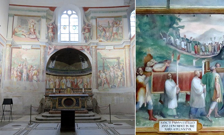 The church was dedicated to St. Stephen the Protomartyr, the first Christian martyr, but it did not have a relic of him. According to tradition the body of the saint was moved from Jerusalem to Damascus, to Constantinople and eventually to Rome where Pope Pelagius II placed it next to that of St. Lawrence in Basilica di S. Lorenzo fuori le mura. This shortcoming of S. Stefano Rotondo was overcome in ca 640 when Pope Theodore I decided to move there the relics of Sts. Primus and Felician (late IIIrd century martyrs) from their burial site near today's Mentana.