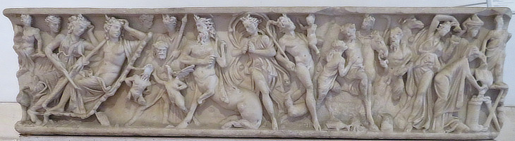 Museo Nazionale Romano: early IIIrd century AD sarcophagus which was found near S. Stefano Rotondo; it depicts a "thiasos", i.e. Dionysus/Bacchus and his retinue of satyrs and maenads