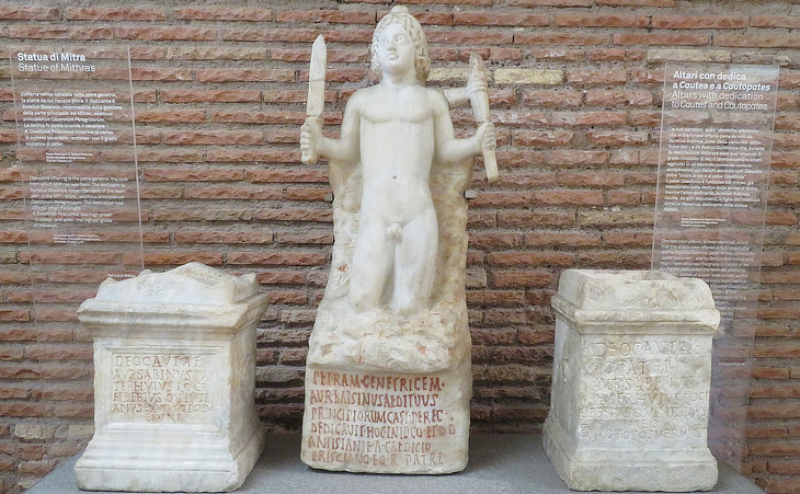 Museo Nazionale Romano: votive statue of the "petra genitrix", the rock from which Mithra was born holding a knife and a torch, between two altars dedicated to Cautes and Cautopates, two torchbearers; the central inscription makes explicit references to the mithraeum of Castra Peregrina (late IInd century AD); the concept of "rock that gives birth" calls to mind Matthew (16:18): "Tu es Petrus, et super hanc petram aedificabo Ecclesiam meam". King James Bible: Thou art Peter, and upon this rock I will build my church
