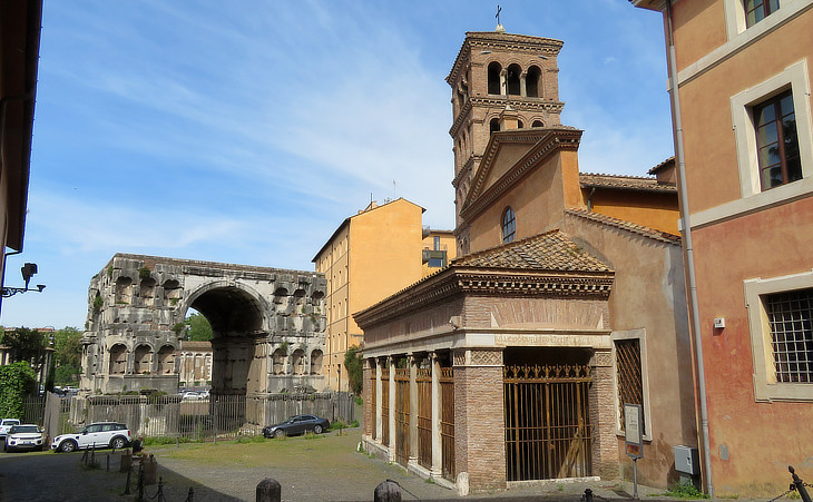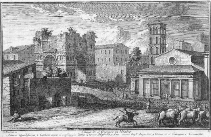 In 1830 the upper part of Arco di Giano Quadrifronte was pulled down because it was assumed to be a medieval tower added by the Frangipane to the Roman arch as part of their fortifications around the Palatine. It was instead the attic of the monument which had entirely lost its marble facing. Arco degli Argentieri is hidden by the church.