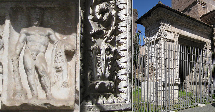 This small arch was erected in 204 by argentarii (money-changers) and cattle dealers in honour of Emperor Septimius Severus: the decoration and the inscriptions made reference to that emperor and his two sons: Caracalla and Geta. After Caracalla murdered Geta all references to the latter were deleted (see how). The relief portraying Hercules is due to the traditional account which sets one of his labours in this part of Rome, where a temple to him still exists (it was turned into a church).