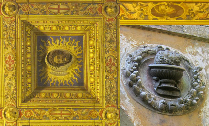 (left) Central panel of the ceiling of the church; (right above) another detail of the ceiling; (right below) relief in the cloister