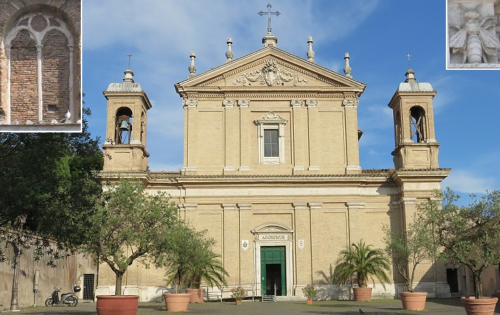 S. Anastasia: (left upper corner) window of the late XVth century building; (right upper corner) a bee, heraldic symbol of Pope Urban VIII above the entrance