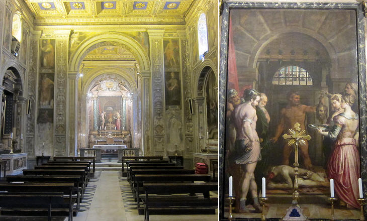 (left) Interior; (right) Decollation of St. John the Baptist by Giorgio Vasari; see images of beheadings at Oratorio dei Bianchi, a brotherhood similar to Misericordia in Palermo and the stucco relief of another similar brotherhood at Avignon
