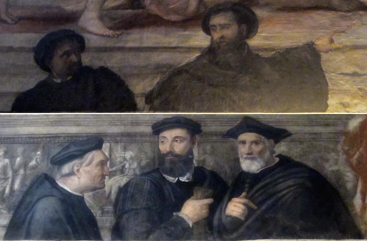 Details of 1551 frescoes by Francesco Salviati in the oratory showing members of the brotherhood including Michelangelo (the man with the long beard in the upper image); see other paintings by Salviati showing the influence of Michelangelo at S. Maria dell'Anima and at Galleria Nazionale di Palazzo Barberini