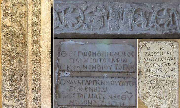 (left) Fragment of ancient Roman lintel; (right-above) a relief with a scene depicting the Annunciation to Zacharias; (right-below) Greek and Latin inscriptions on the wall of the portico