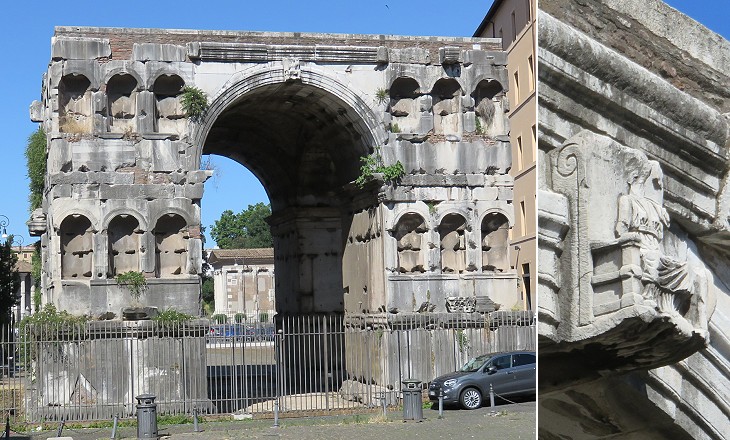 (left) Arco di Giano (eastern side) and behind it Tempio di Portuno; (right) small statue of seated Rome or Juno on the arch keystone