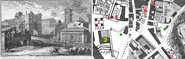 2) Paper mill above Cloaca Massima; 3) Arco degli Argentieri; 4) S. Giorgio al Velabro. The small 1748 map shows also:
