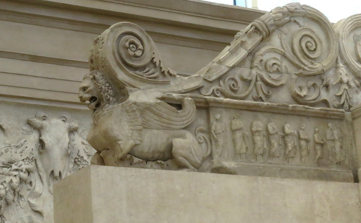 The interior of the altar was decorated with marble panels depicting bucrania and festoons. The table upon which sacrifices were performed, the actual altar, is almost entirely lost, exception made for two fragments which decorated its upper part. They show vegetable volutes above winged lions (or rather sphinxes with a lion head) and a small relief depicting a religious ceremony, perhaps that which was attended by the imperial family.