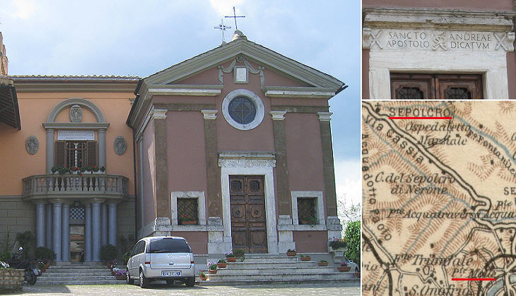 (left) S. Andrea Apostolo and the entrance to the adjoining nunnery; (right-above) detail of the façade; (right-below) early XXth century map of the environs of Rome showing Ponte Molle (Milvio) and the location of the church near the supposed tomb (sepolcro) of Emperor Nero