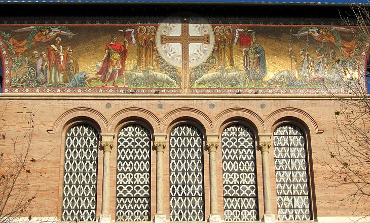 Detail of the façade of S. Croce al Flaminio, a church built near Ponte Milvio in 1913 to celebrate the 1600th anniversary of the Edict of Tolerance by Constantine and Licinius. Mosaic by Biagio Biagetti
