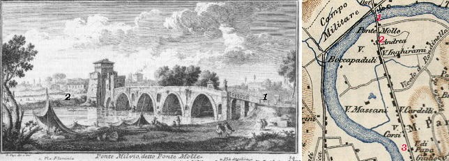 In the description below the plate Vasi made reference to: 1) Via Flaminia; 2) Via Angelica (leading to Porta Angelica). The small 1920 map shows 1) Ponte Milvio (in the past it was more usually called Ponte Molle); 2) Statua di S. Andrea; 3) Tempio di S. Andrea.
