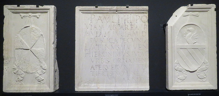 (left) Palazzo Sangalletti with a typical "strigilato" sarcophagus; (right-above) coat of arms of Mons. Guglielmo Sangalletti, personal assistant to Pope Pius V. In 1593 he was charged with embezzlement; he fled to Florence and his properties were confiscated; (right-below) inscription mentioning