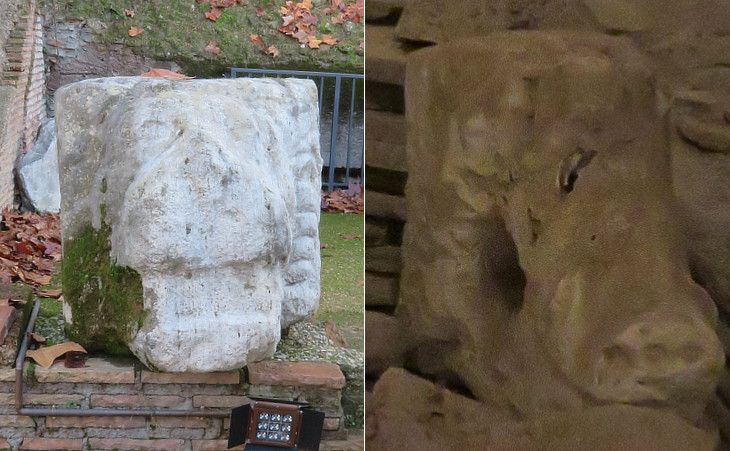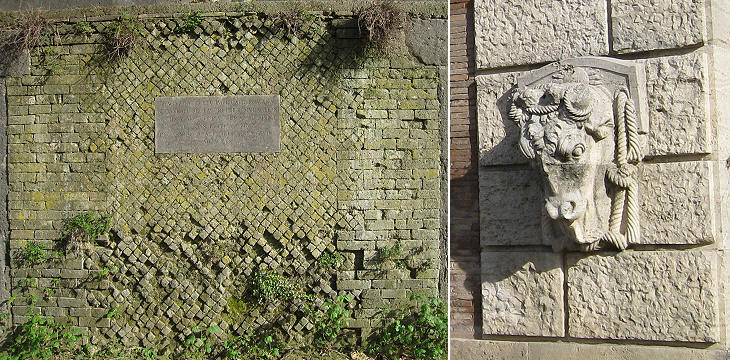 (left) A reconstructed ancient Roman wall in "opus reticulatum"; (right) reconstruction of a bull head to which the ships were tied