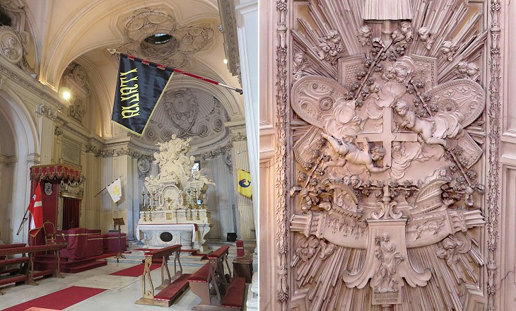 (left) Interior with the flags of the eight historical "Langues" which grouped the Knights by land of origin; (right) stucco ceiling with ancient military emblems