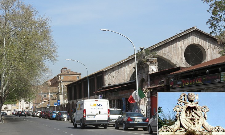 Arsenale Pontificio seen from Via Portuense leading to Porta Portese which is visible at the end of the road; (inset) coat of arms of Pope Pius IX