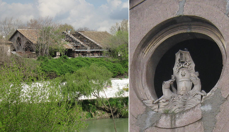 (left) Arsenale Pontificio seen from the left bank of the river; (right) a "Rule the Waves" coat of arms of Pope Clement XI