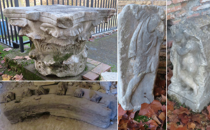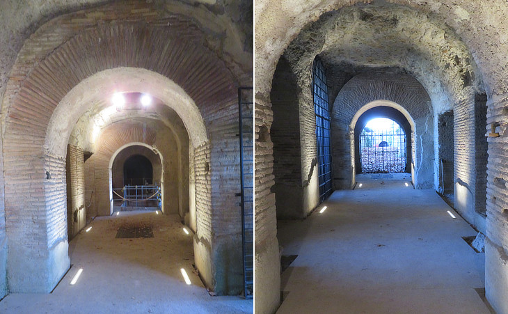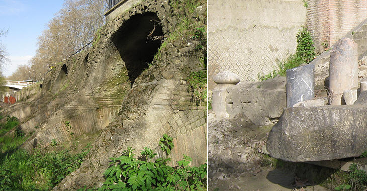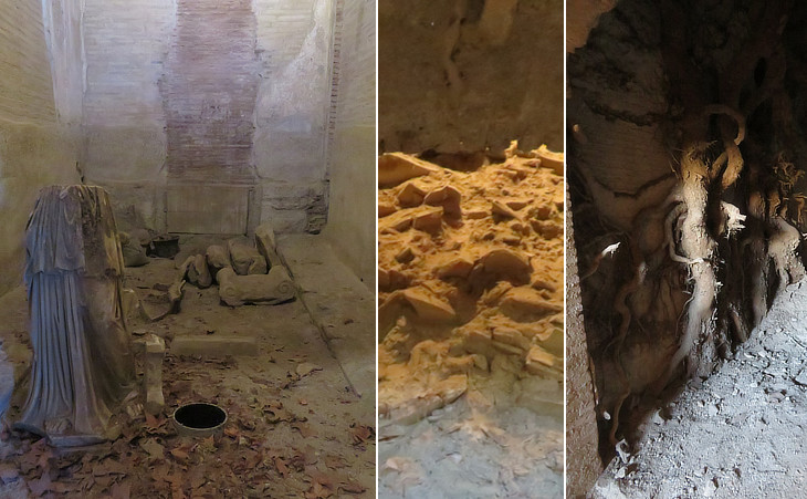 Warehouses of the cryptoporticus: (left) emptied warehouse containing fragments of decorated stones which were found during the excavations; (centre) warehouse still filled with broken "testae"; (right) warehouse with roots of the trees along the Lungotevere