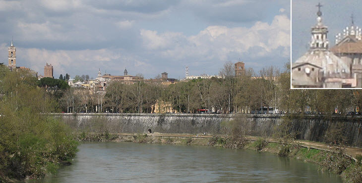View towards the centre of Rome in April 2009: (left to right) Tower of Campidoglio, Torre delle Milizie, dome of SS. Luca e Martina and bell tower of S. Maria in Cosmedin (the enlargement shows the dome of SS. Luca e Martina and behind it the upper part of SS. Domenico e Sisto)