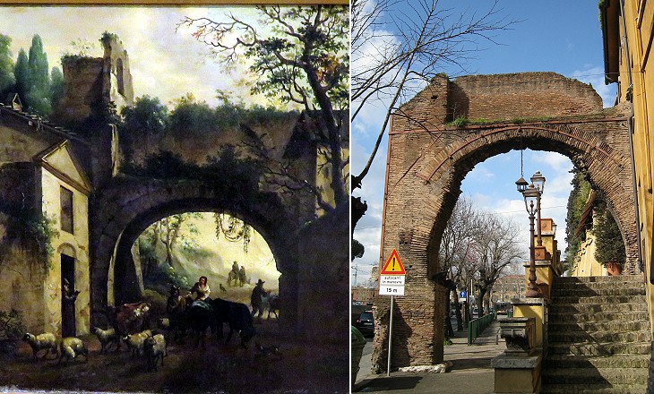 (left) Museo di Roma a Palazzo Braschi: Arco di S. Lazzaro and the adjoining church by Dutch painter Jan Asselyn (ca 1640); (right) Arco di S. Lazzaro