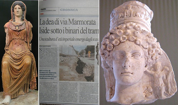 (left) Museo Nazionale Romano: Statue of Minerva (the head is modern) found in the 1920s in Via Marmorata; (centre) newspaper reporting the finding of a Head of Artemis (not Isis); (right) the head at Palazzo Altemps