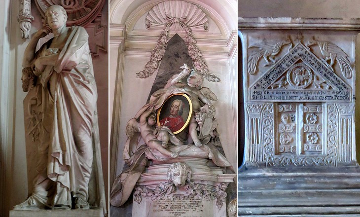 (left) Monument to Giovanni Battista Piranesi by Giuseppe Angelini (1780). Piranesi was depicted as an ancient Roman senator; the monument was highly praised by Antonio Canova, the greatest Italian neoclassical sculptor; (centre) Monument to Cardinal Joaquín Fernández de Portocarrero (d. 1760) by Luigi Salimei. The Cardinal joined the Order in 1716 and eventually became the admiral of the fleet. In 1730 he entered the ecclesiastical career. His monument followed a traditional pattern; (right) medieval relief/altar of unknown origin and awkward dating