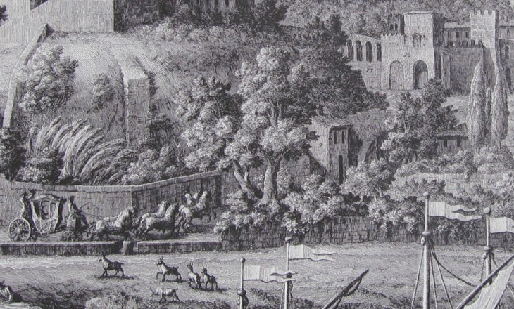 The beach from which Vasi took his view does not exist any longer, because of the changes made to the river bed in the 1880s to facilitate the flow of the water. They led to the disappearance of small mills, salt-works and other establishments at the foot of the Aventine. Vasi enlarged the dimensions of the buildings of Rome at the centre of the etching. In order to see the dome of SS. Luca e Martina it is necessary to move forward and stand on a modern bridge.