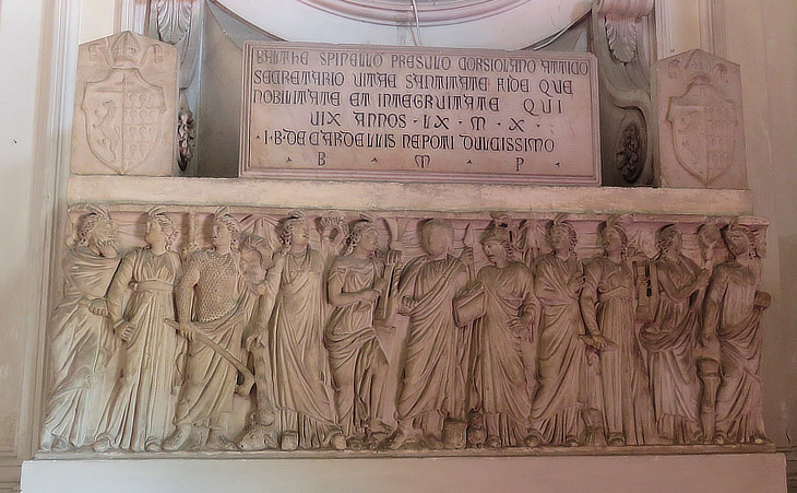 Monument to Baldassarre Spinelli (late XVth century) which makes use of a IIIrd century AD sarcophagus portraying Minerva, Homer and the Muses