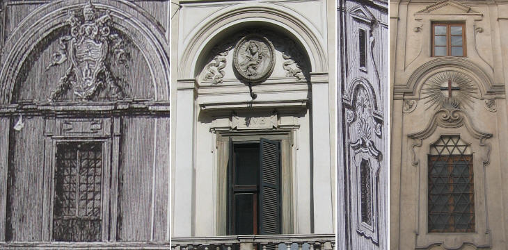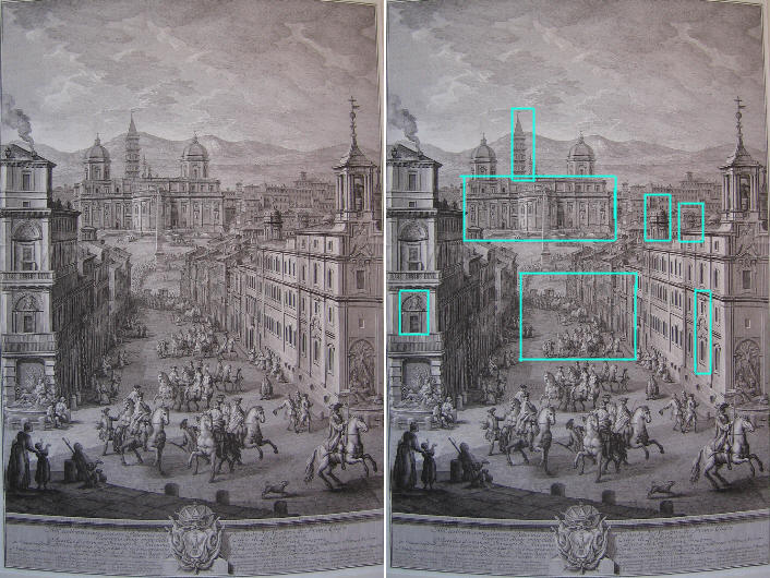 Vasi was an architect, not a painter, and this is evident in the attention he paid to show the details of the buildings accurately. This accuracy allows easy identification of changes which occurred after 1771: Palazzo Albani was acquired by the Del Drago family and the coat of arms of Pope Clement XI Albani was replaced by a sacred image.