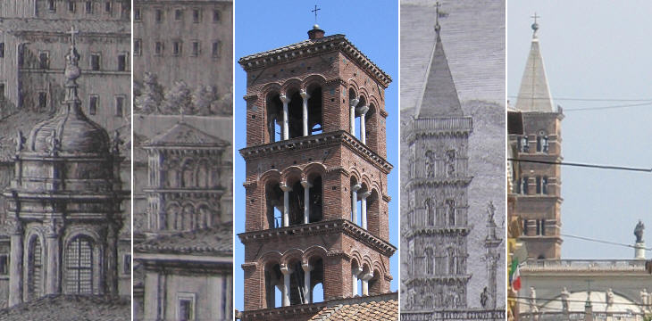 (left) Lost dome of S. Dionigi Areopagita; (centre) bell tower of S. Pudenziana; (right) bell tower of S. Maria Maggiore