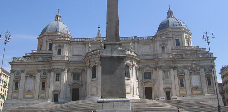 The rear view of S. Maria Maggiore is perhaps more imposing than the front one. Its location at the top of the Esquilino hill, two large chapels built respectively by Pope Sixtus V (to the left) and Pope Paul V (to the right) and the obelisk placed by Pope Sixtus V, were all elements which led Gian Lorenzo Bernini to design an imposing rear façade: his project was based on the enlargement of the apse (which would have meant the loss of its mosaics) and on a double portico decorated with 47 statues. The project was commissioned by Pope Clement IX and work started in September 1669. The Pope died just three months later and neither his heirs, nor the new pope (Pope Clement X) were prepared to move forward with such an expensive plan. Carlo Rainaldi was asked to prepare a simpler design and by 1673 the tribune as we see it today was completed: it was decorated with only four close to Heaven statues.