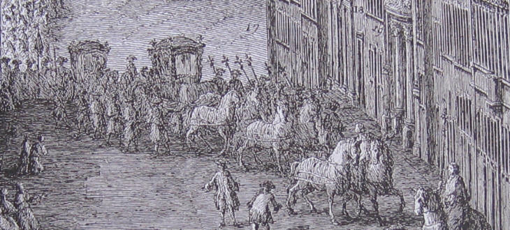 Vasi did not give details about the procession he showed in the etching: he had shown a similar procession in his 1756 etching (plate 122) and there again he did not make specific reference to it. The procession is unlikely to be linked to a religious ceremony, while it is possible that Vasi had in mind the visit paid by Charles VII, King of Naples to Pope Benedict XIV in 1744.