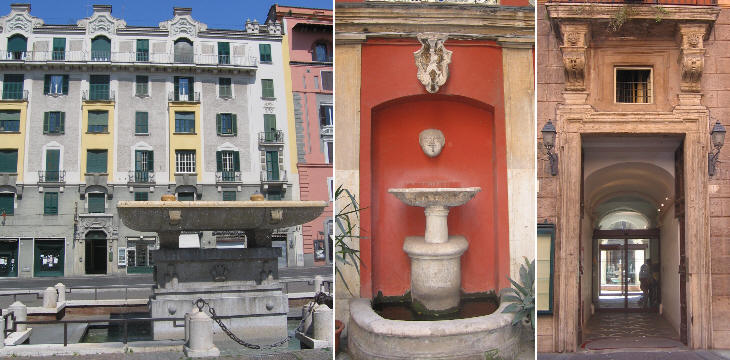 (left) Building by Marcello Piacentini in Via Agostino de Pretis; (centre/right) a courtyard and an entrance of buildings in Via delle Quattro Fontane