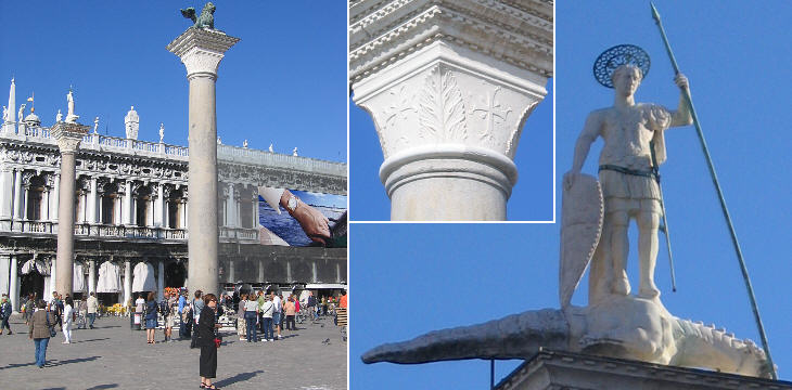 (left) Columns in Piazza S. Marco; (centre and right) Byzantine capital and statue of St. Theodore