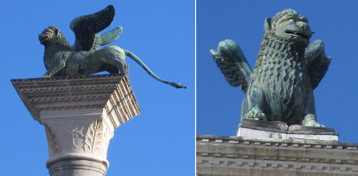 The Venetians placed a statue of St. Theodore on one of the two tall granite columns they brought from the Levant: on the other they did not place a statue of St. Mark, but rather a statue of his symbol: a lion. The ancient bronze statue was modified and restored several times and both the wings and the long tail are thought to be later additions: the original parts show features of Assyrian/Persian art: most likely the lion was bought by Venetian merchants in Syria.