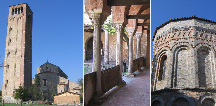 Torcello: (left) bell tower and rear view of the cathedral; (centre/right) S. Fosca: the narthex and the apse