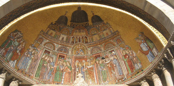 The body of the saint was placed in a church dedicated to him next to the residence of the Doge. An old mosaic, most likely designed by artists from Constantinople, shows the translation of the body and the appearance of the church at the end of the XIth century; it also portrays a very affluent society.